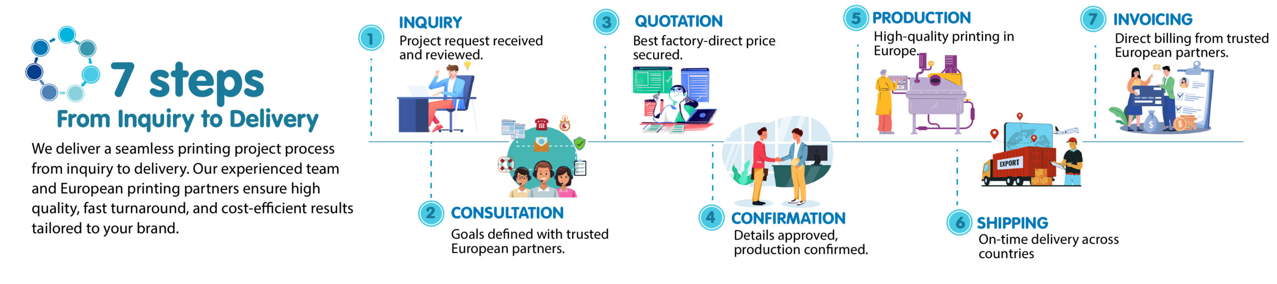 Som repræsentant for nogle af de største trykkerier i Europa giver vi dig direkte adgang til producenterne. Med vores 30 års erfaring i branchen ved vi præcis, hvor den optimale produktionslinje til dit specifikke produkt findes.