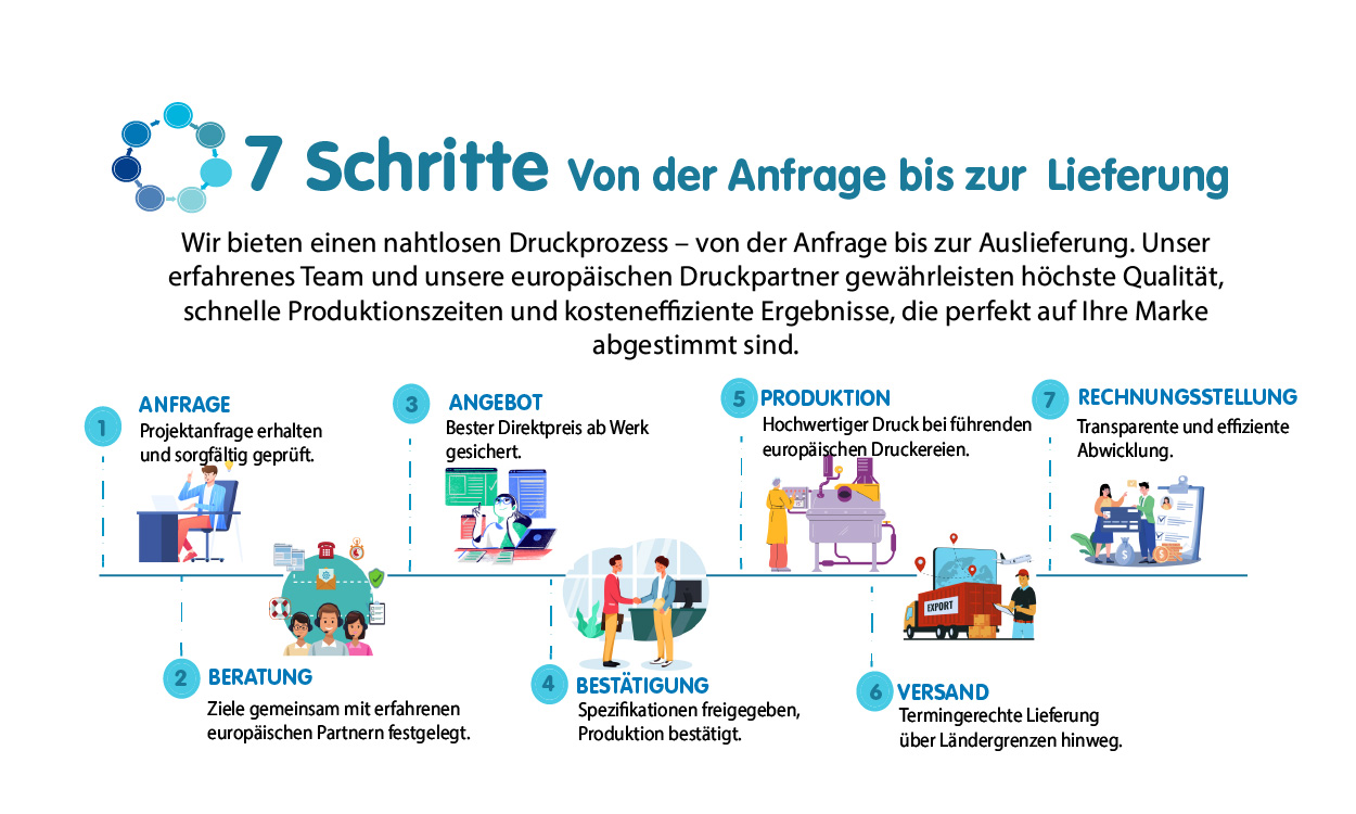 3️⃣ ANGEBOT – Nach der Projektdefinition verbinden wir Sie mit einem unserer vertrauenswürdigen europäischen Druckpartner, um technische Anforderungen zu bewerten und den bestmöglichen Direktpreis zu sichern.